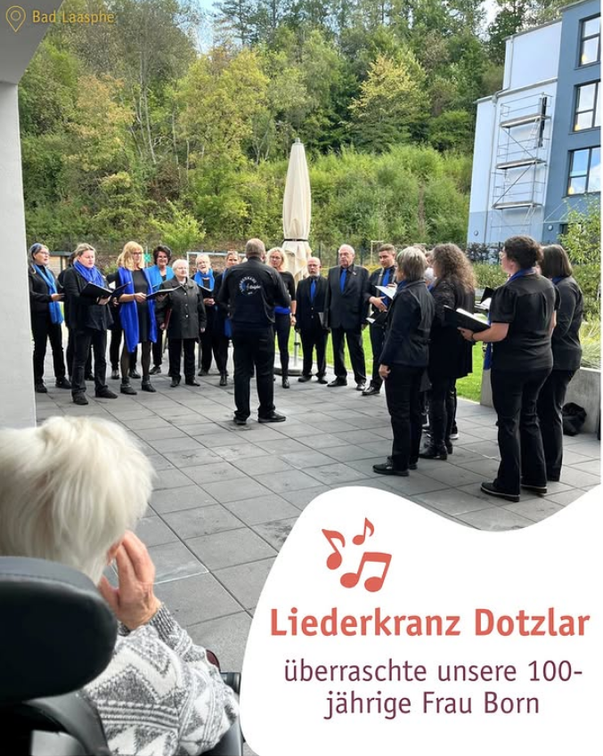 Der Liederkranz Dotzlar hatte sich angekündigt, um Frau Born zu ihrem 100. Geburtstag ein Ständchen zu bringen. Überrascht und sichtlich gerührt lauschte sie den Liedern, während im Hintergrund die anderen Bewohner*innen die Melodien mitsummten.