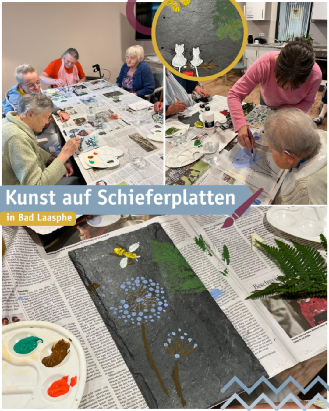 In der Seniorenresidenz in Bad Laasphe stand der Kunstworkshop mit Frau Straatman diesmal ganz im Zeichen des Schiefers. Mit viel Neugier und Freude wurden Platten gestaltet – mit Blumen, Schmetterlingen oder Blättern – und entwickelten sich zu kleinen, einzigartigen Kunstwerken.