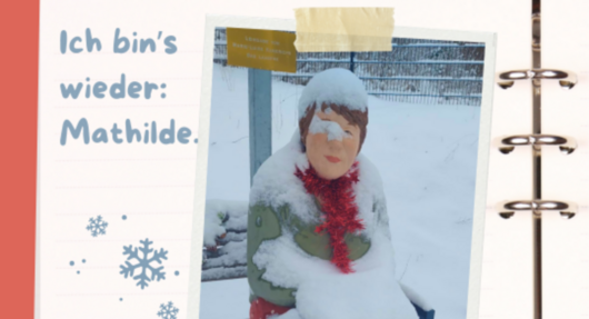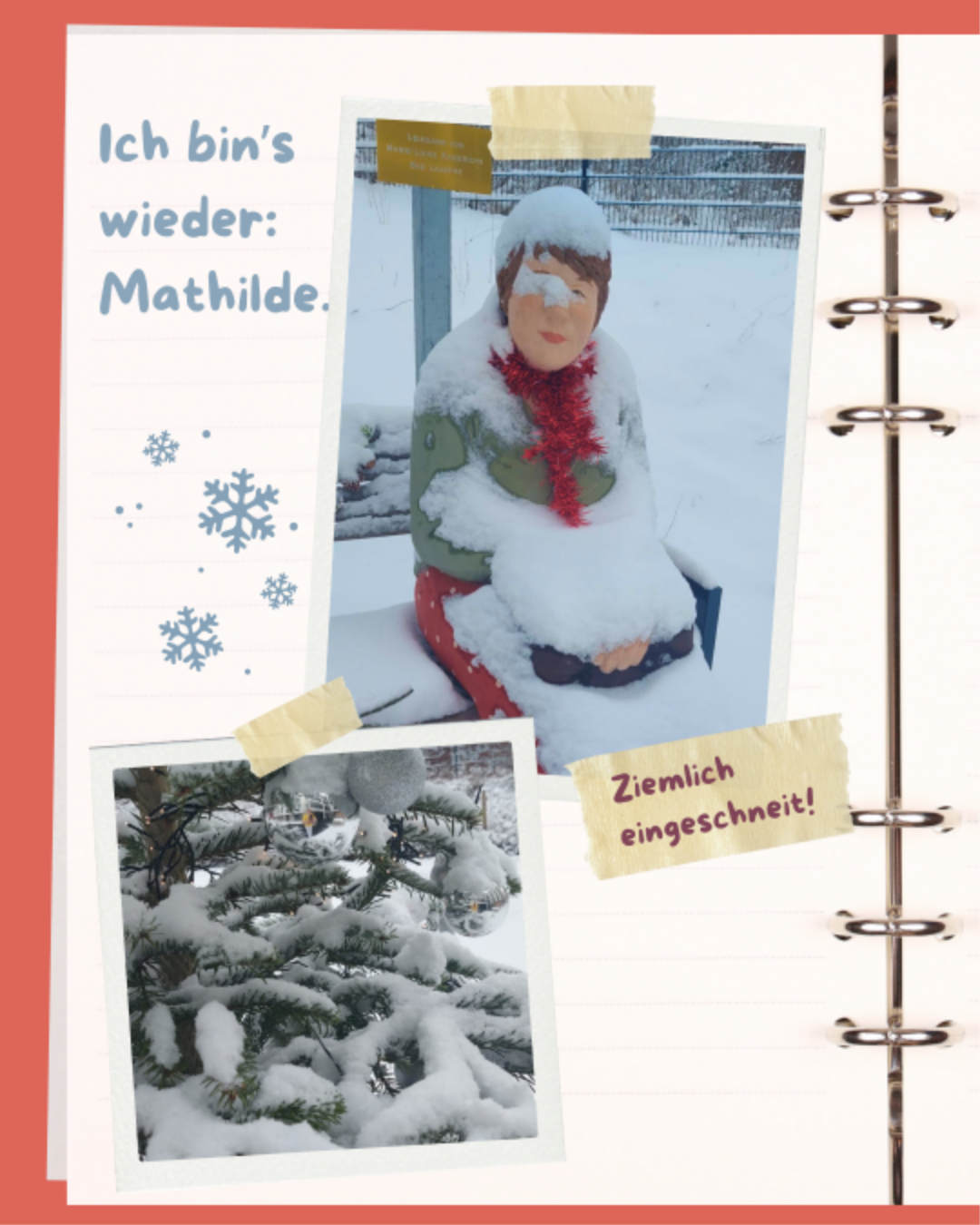 Derzeit zeigt sich ihr Platz von seiner winterlichen Seite: Schnee legt sich über Beete und Wege und verwandelt alles in eine ruhige, fast stille Landschaft. Von ihrer Bank aus schaut Mathilde zu, wie die Flocken fallen, Spuren im Schnee entstehen und die Bewohner*innen vorbeikommen.