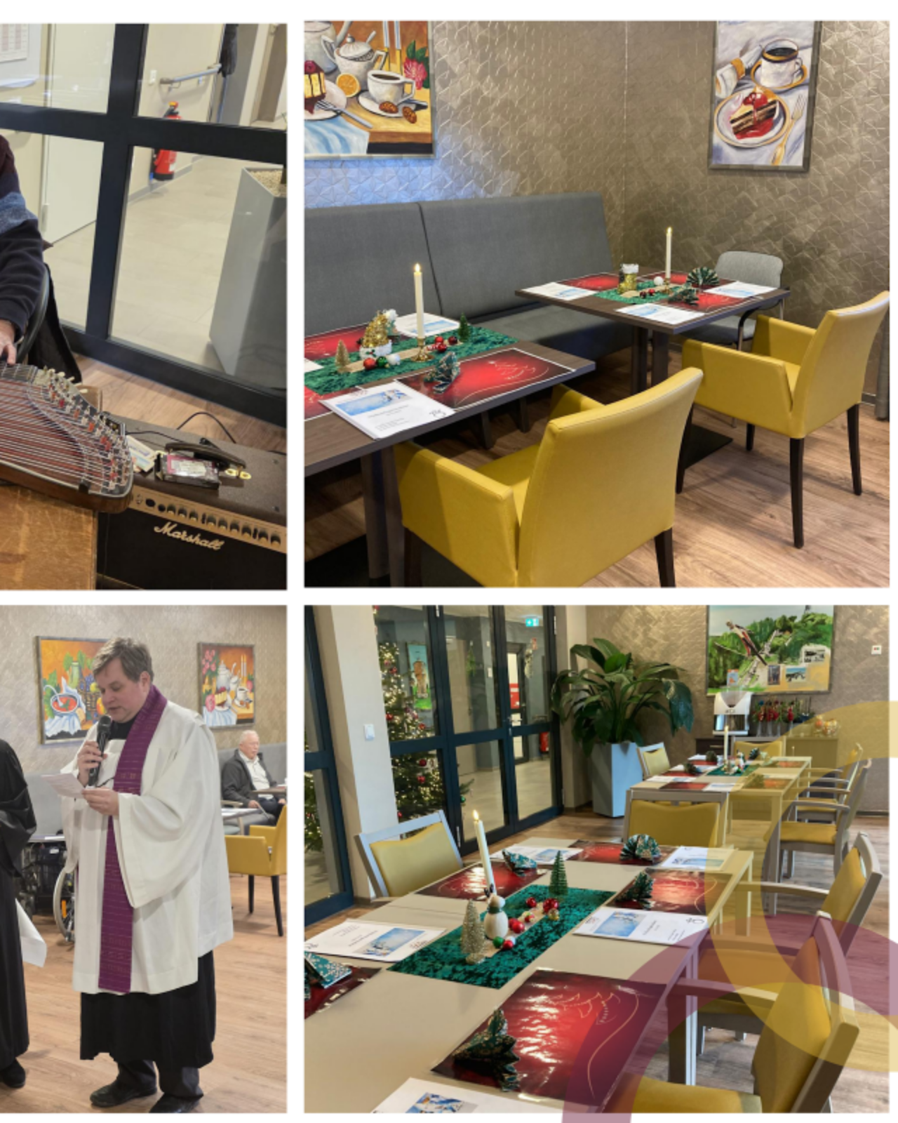 Der festliche Gottesdienst, musikalisch begleitet von Herrn Meier auf der Zither, brachte sofort eine warme, besinnliche Stimmung ins Haus. Pfarrer Herr Kemper-Kohlhase (ev.) und Pastor Herr Beilike (kath.) führten durch die Zeremonie, die von Bewohner*innen und Gästen aufmerksam verfolgt wurde.