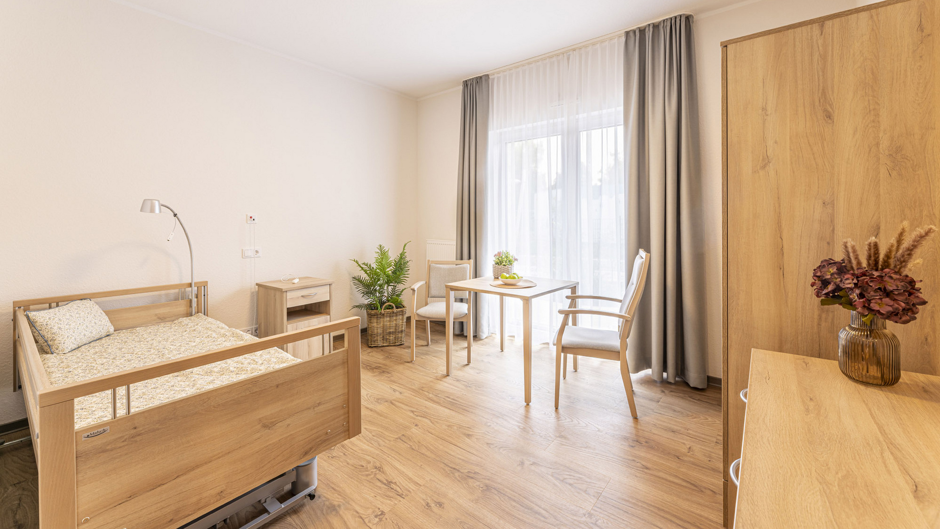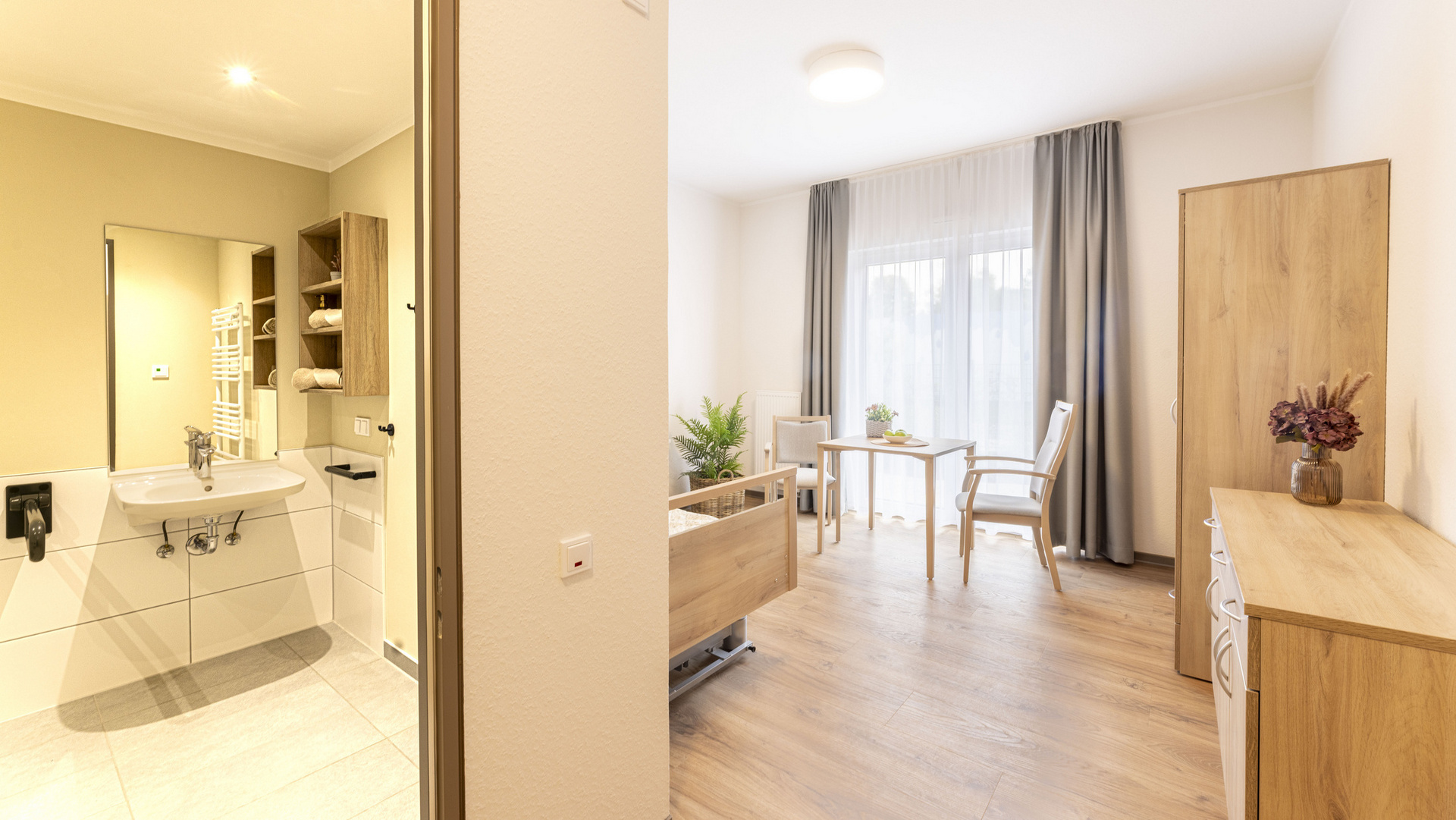 Unsere hellen und freundlichen Einzelzimmer mit einer Größe von ca. 23 - 24m² inkl. barrierefreiem Bad bieten unseren Bewohner*innen die Möglichkeit, eigene Möbel und Accessoires mitzubringen. Denn liebgewonnene Gegenstände oder persönliche Fotos schaffen eine vertraute Umgebung und helfen dabei, sich an einem neuen Ort wohlzufühlen. Mit dieser individuellen und gemütlichen Atmosphäre schaffen wir für die Bewohner*innen ein neues zu Hause – ein neues Stück Heimat. Selbstverständlich steht in allen Zimmern Internet und Telefon zur Verfügung.